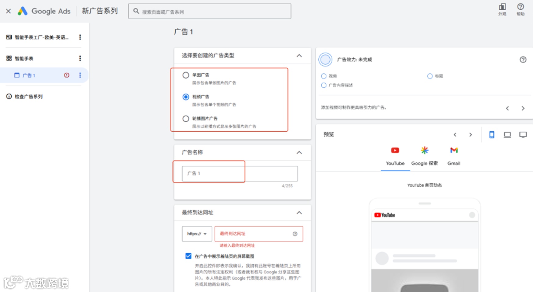 选择广告格式:若无视频,可选单图或轮播广告;若有视频,需提前上传至YouTube并获取链接。