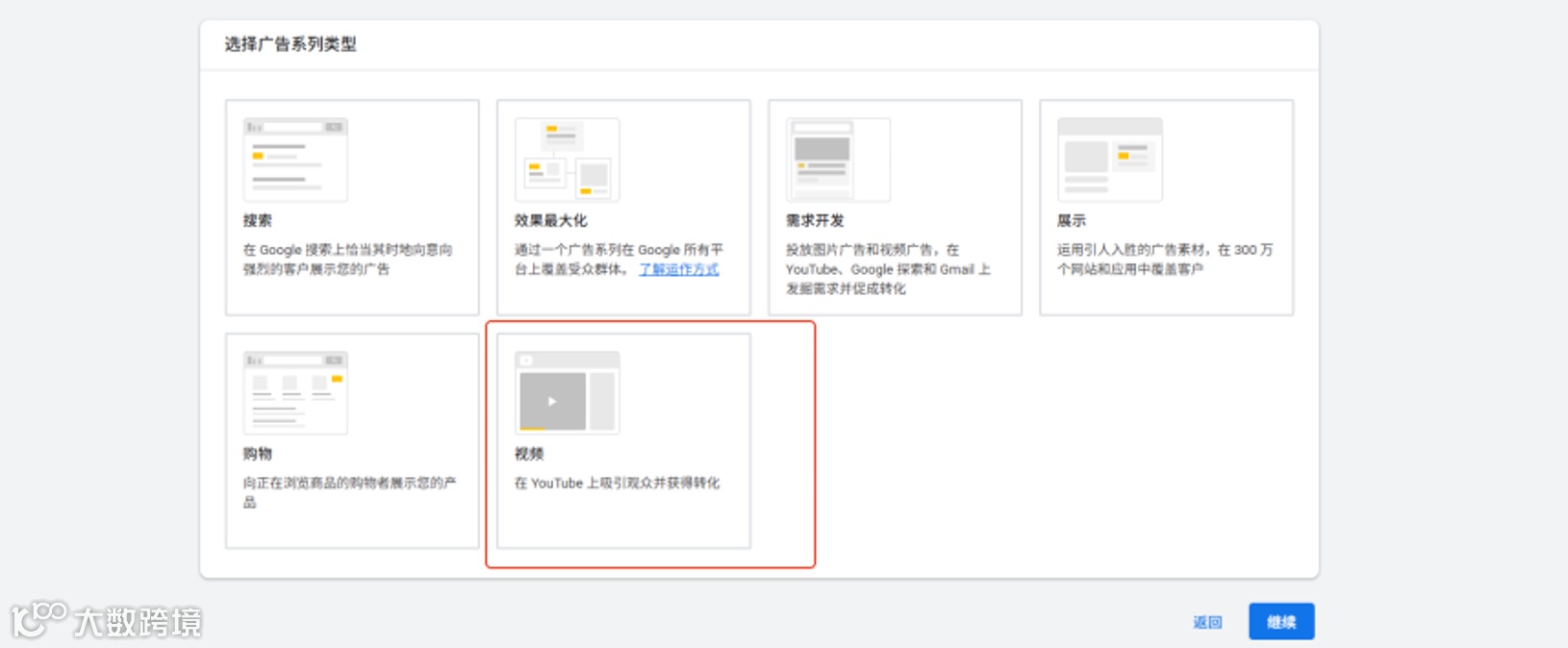 登录Google Ads后台,点击“创建”按钮,选择“广告系列”。目标建议选择“潜在客户”,广告类型选择“视频—在Youtube上吸引观众并获得转化”。