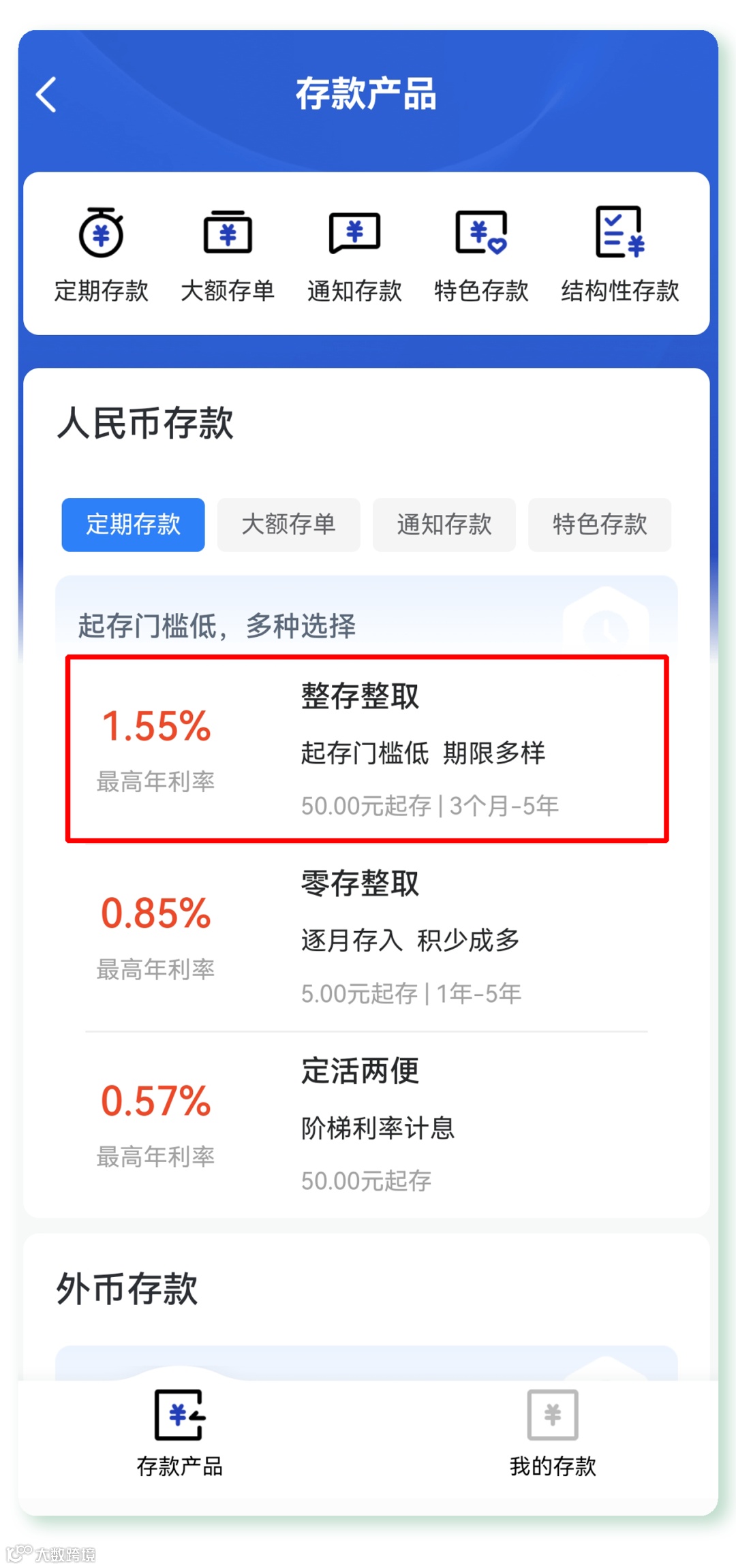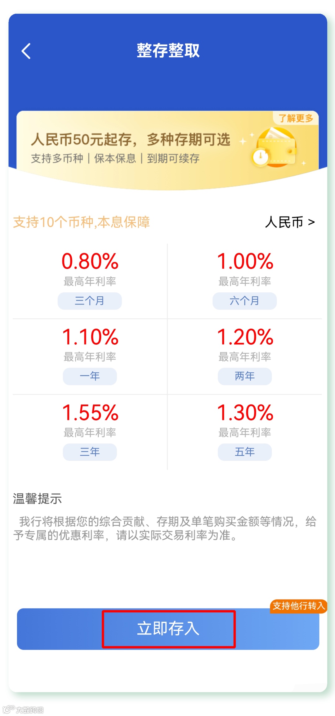 人民币整存整取50元起存,外币整存整取等值50元人民币起存。