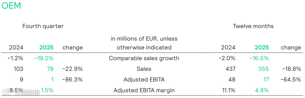 销量下滑与毛利率压力叠加,致使OEM业务盈利能力大幅受损,全年调整后EBITA利润率仅为4.8%。
