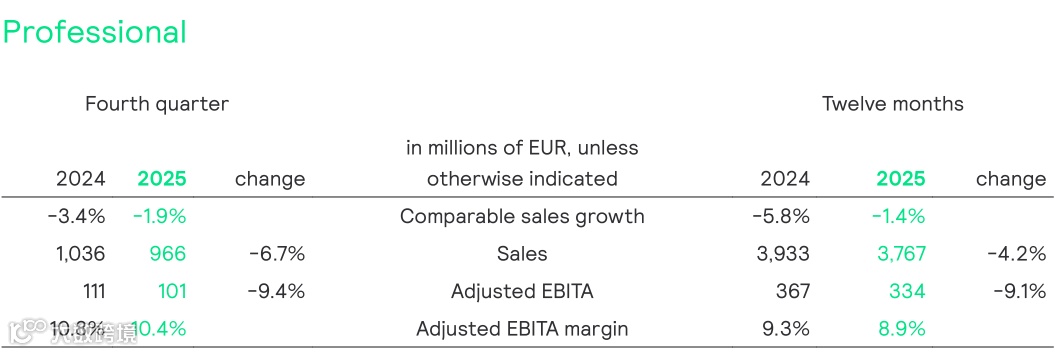 专业照明业务全年实现销售额37.67亿欧元(约合人民币308.5亿元),名义下降4.2%;传统照明业务销售额为3.27亿欧元(约合人民币26.7亿元),可比销售下降23.1%,调整后EBITA利润率为16.1%。