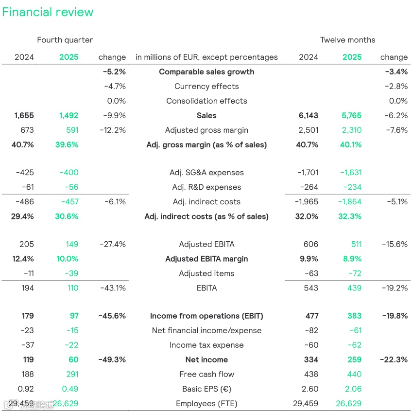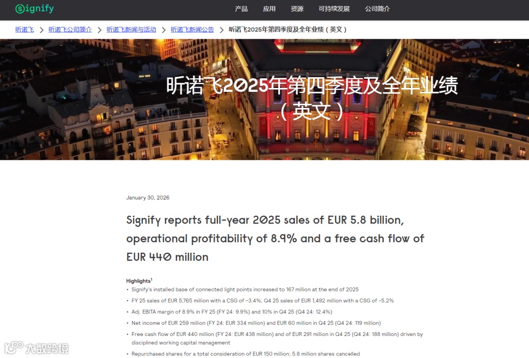 根据财报,昕诺飞2025年全年销售额为57.65亿欧元(约合人民币472.7亿元),同比下降3.4%;第四季度销售额为14.92亿欧元(约合人民币122.2亿元),同比下滑5.2%。