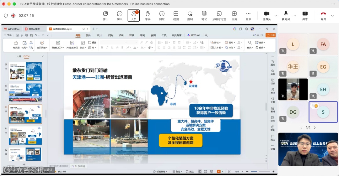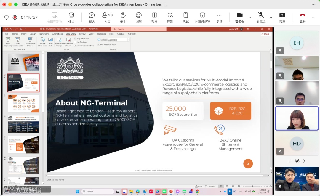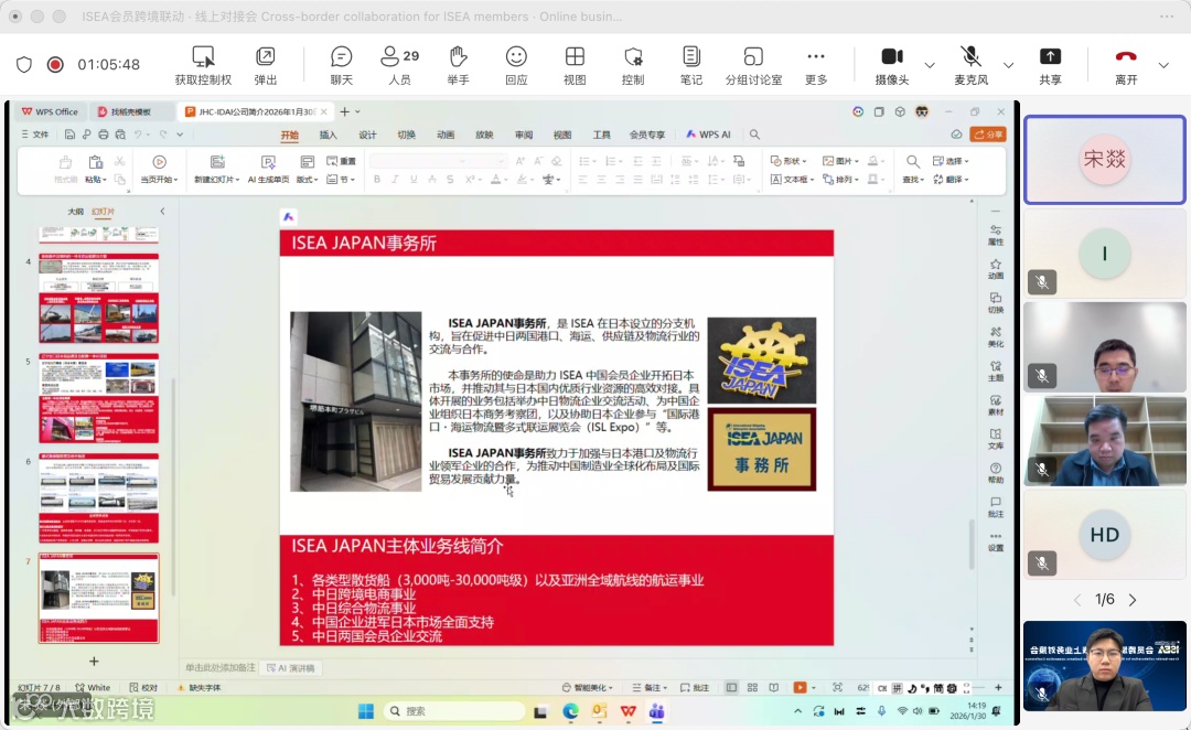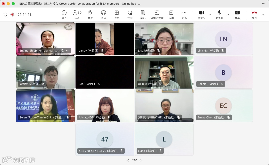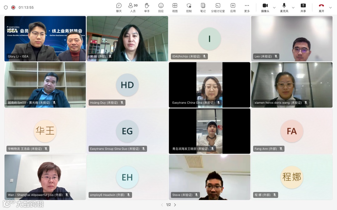 2026年1月30日,国际航贸物流平台(ISEA)成功举办“ISEA会员跨境联动・线上业务对接会”。本次活动依托Microsoft Teams平台,汇聚来自越南、马来西亚、菲律宾、泰国、日本、英国、尼日利亚等7个国家的海外会员企业,以及大连、天津、青岛、上海、宁波、厦门、深圳等国内重点口岸近30家优质物流企业,通过“精准对接+高效互动”模式,搭建起跨境物流行业的云端合作桥梁。多家企业在会上达成初步合作意向,实现跨境业务的高效落地。