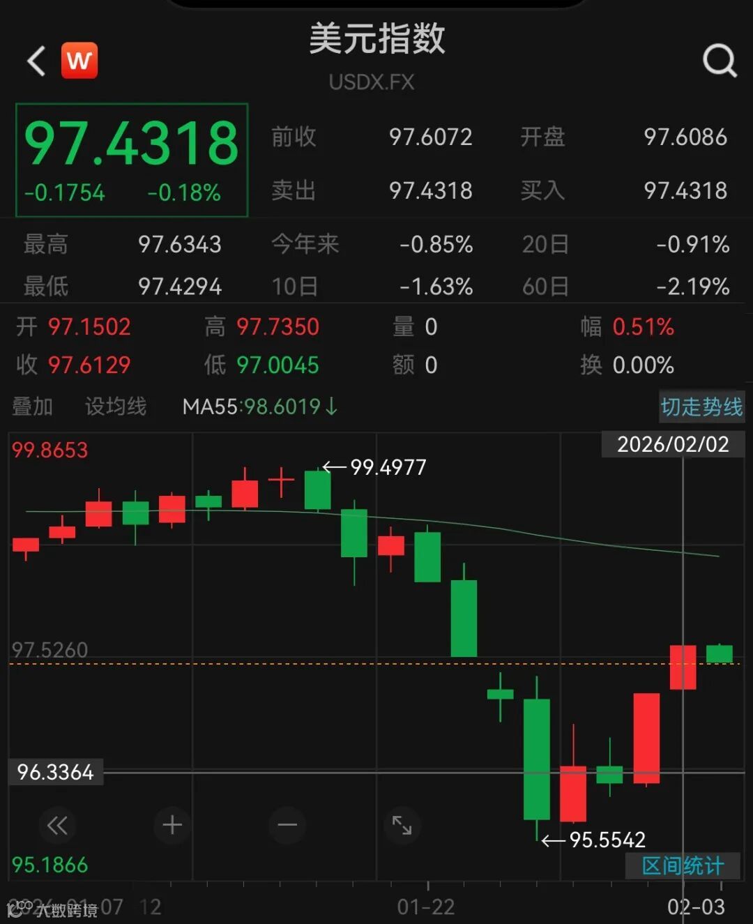 美元指数短期走势受“政策宽松预期”与“避险需求”双重影响。2月2日,美指上涨0.51%,收于97.6129。