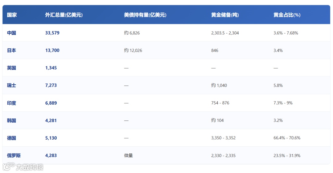 根据最新数据,全球部分经济体在外汇储备、美国国债和黄金储备上的配置呈现出显著差异(见下表)。