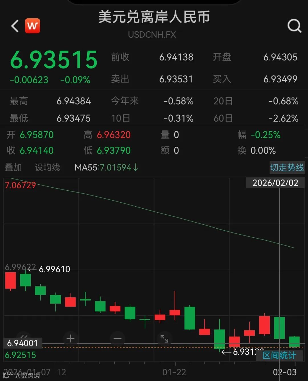 2月2日,美元兑离岸人民币下跌0.25%至6.9414,结束三连涨;美元兑在岸人民币微涨0.04%至6.9513。