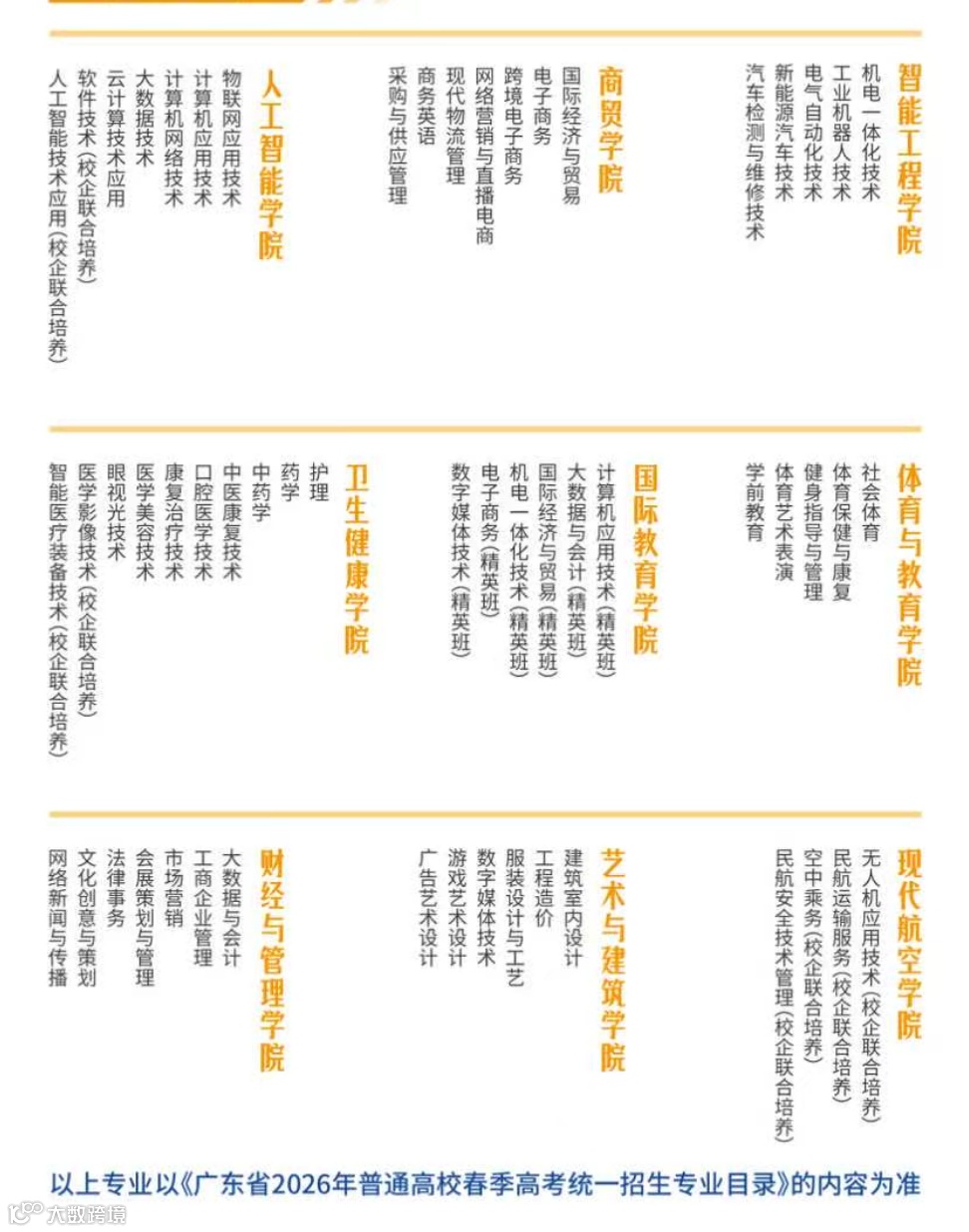 ● 学校根据粤港澳大湾区经济发展的产业需求,开设有人工智能技术应用、软件技术、无人机应用技术、电子商务、机电一体化、药学、口腔医学技术、电气自动化、医学影像技术、数字媒体技术、大数据与会计、学前教育、网络营销与直播电商、新能源汽车技术、法律事务、社会体育等58个专科专业。