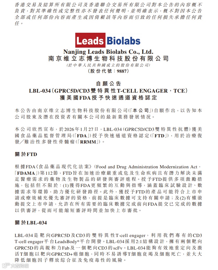 南京维立志博生物科技股份有限公司(以下简称“维立志博”或“公司”,股票代码:9887.HK)宣布,公司基于TCE技术平台LeadsBody®自主研发的具有独特2:1结构和条件性激活的GPRC5D/CD3双特异性抗体LBL-034于2026年1月27日获得美国食品药品监督管理局(FDA)授予快速通道资格认定,用于治疗复发/难治性多发性骨髓瘤(RRMM)。