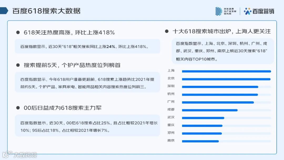 数据显示,近30天内,“618”相关搜索量环比上涨418%,其中00后用户搜索占比达25%,成为活跃主力之一。从地区来看,上海、北京、深圳位列搜索热度前三,展现出较强的消费关注度。
