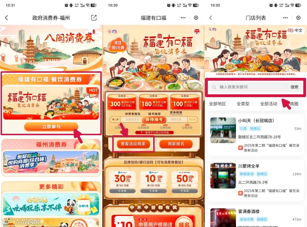 首页点击「政府消费券」专区进入「福建有口福」进入活动页面,点击“查看活动商家”,即可查看可用商户名单,也可以通过搜索框直接进行搜索。