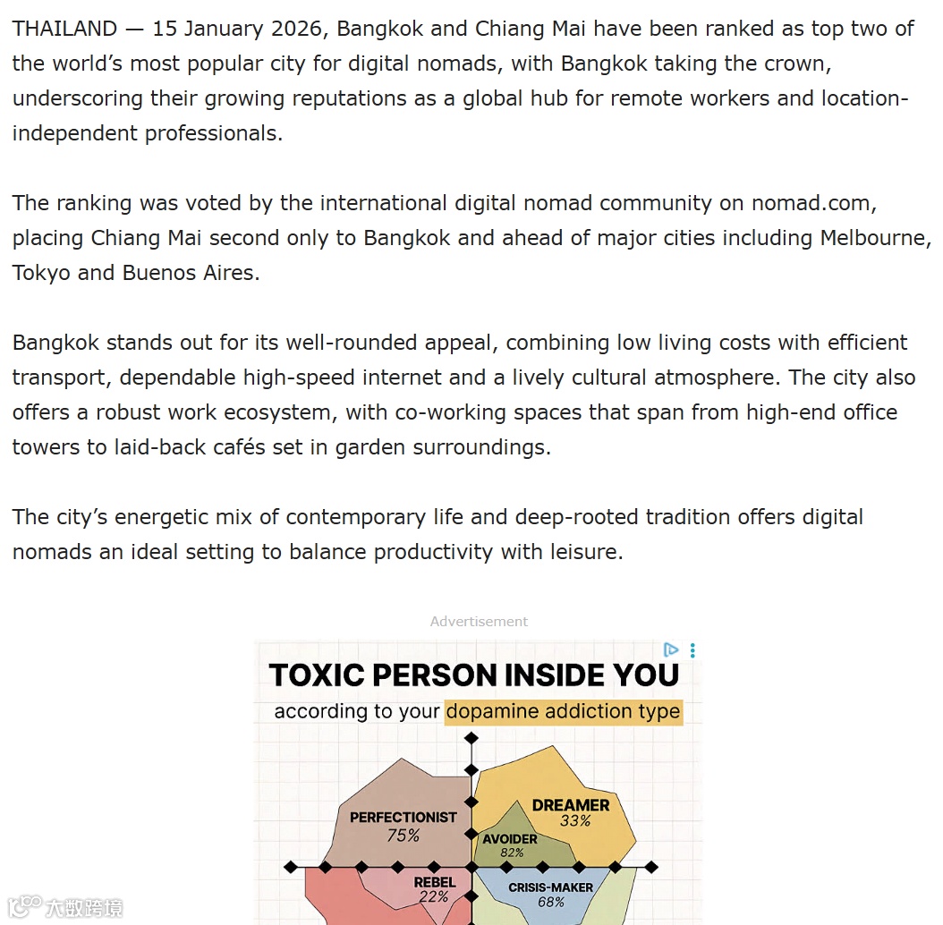 搞了个全球数字游民投票,结果曼谷直接冲到了最受欢迎城市第一名,清迈紧随其后,连