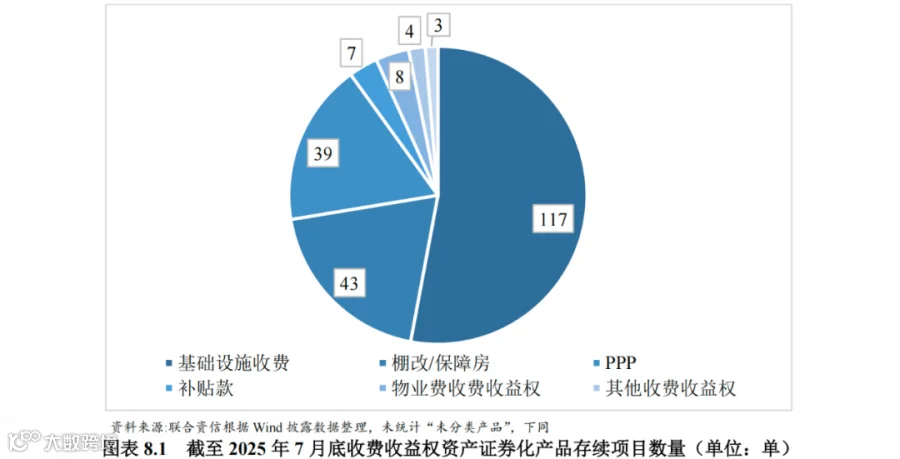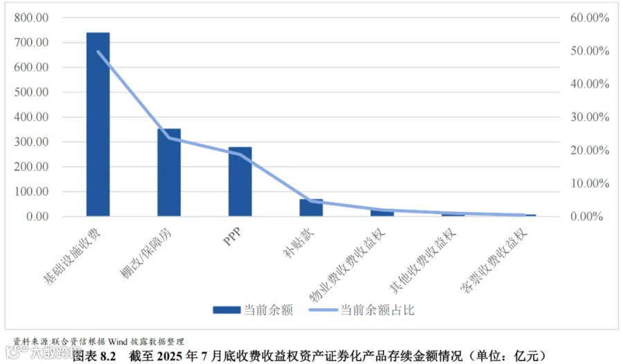 截至2025年7月底,市场存续收费收益权资产证券化产品共221单,余额1484.85亿元,与2024年底基本持平。其中,基础设施收费收益权产品存续金额738.26亿元,占比49.72%;棚改/保障房类351.48亿元,占比23.67%。