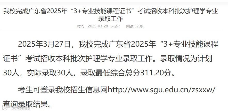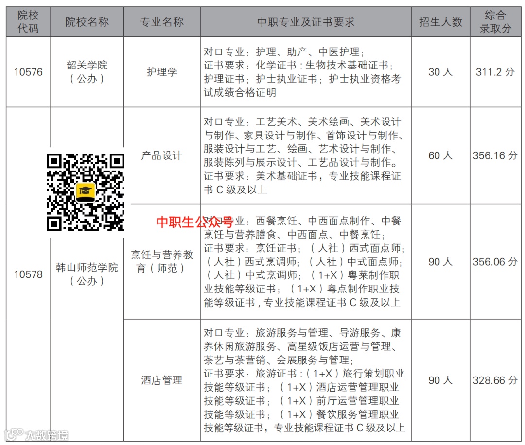 举个例子:2025年3+证书高考本科填报资格线是260分,你想填报韶关学院的护理学专业,那文化科分数必须是260分及以上,而且中职专业是护理、助产或中医护理,证书要求是护理、化学、生物或护士资格证(或执业证书)之一才可填报,填完志愿后还需要参加韶关学院组织的“校测”,通过校测+证书折算+文化科分数得出总分,从高到低择优录取。