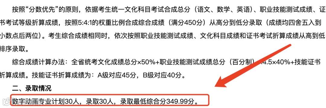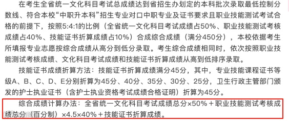 按照5:4:1的比例(全省统一文化科目考试成绩占50%、职业技能测试考核成绩占40%、技能证书折算成绩占10%)合成总分(满分450分),择优录取。
