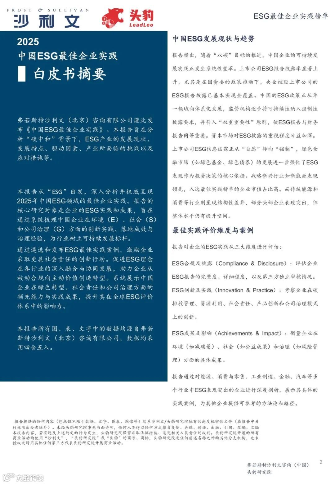 报告基于合规性、创新性与实践成果三大维度,评选发布各行业ESG最佳实践榜单,并深入剖析中国海油、珀莱雅、迈瑞医疗、兴业银行、理想汽车等代表性企业的可量化实施路径。