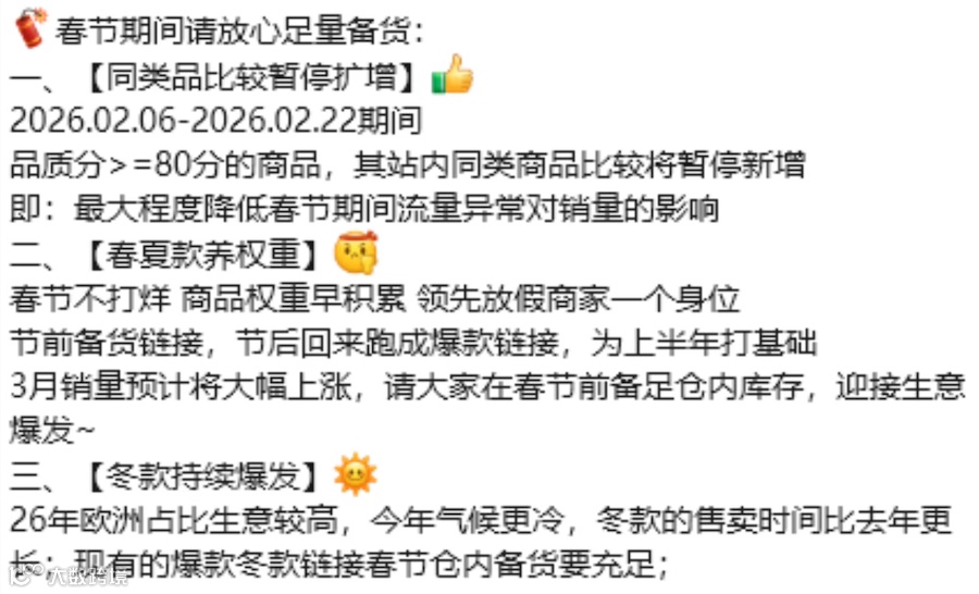 临近春节,Temu买手向卖家发布“春节运营提醒”,其中提及“同类品比较暂停扩增”,被部分卖家解读为高价限流政策的阶段性松绑,迅速引发行业热议。