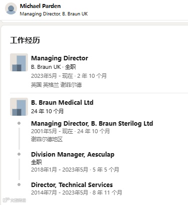 新任CEO Michael Parden自2001年加入贝朗集团,长期在一线管理岗位积累经验。他曾于2010年主导重组子公司B. Braun Sterilog Ltd的运营体系,并于2018年负责外科器械品牌Aesculap的业务管理。自2023年起,担任贝朗英国公司总经理。
