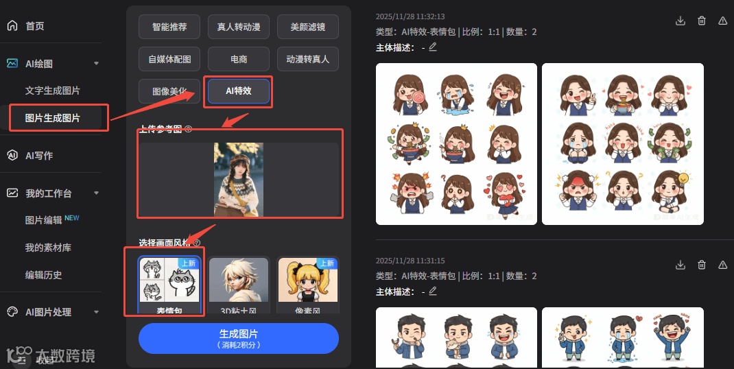 - 点击生成,几分钟即可获得成套Q版表情包。