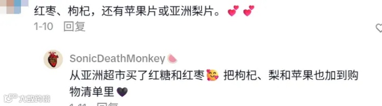 大量外国网友开始记录中式养生方式,“已将枸杞、保温杯加入购物车”。有人列出“中式养生泡茶清单”,包括红枣、枸杞、苹果片、梨片、红糖等。还有网友提问:“热水要多热?”“夏天能喝冷水吗?我在努力适应……”