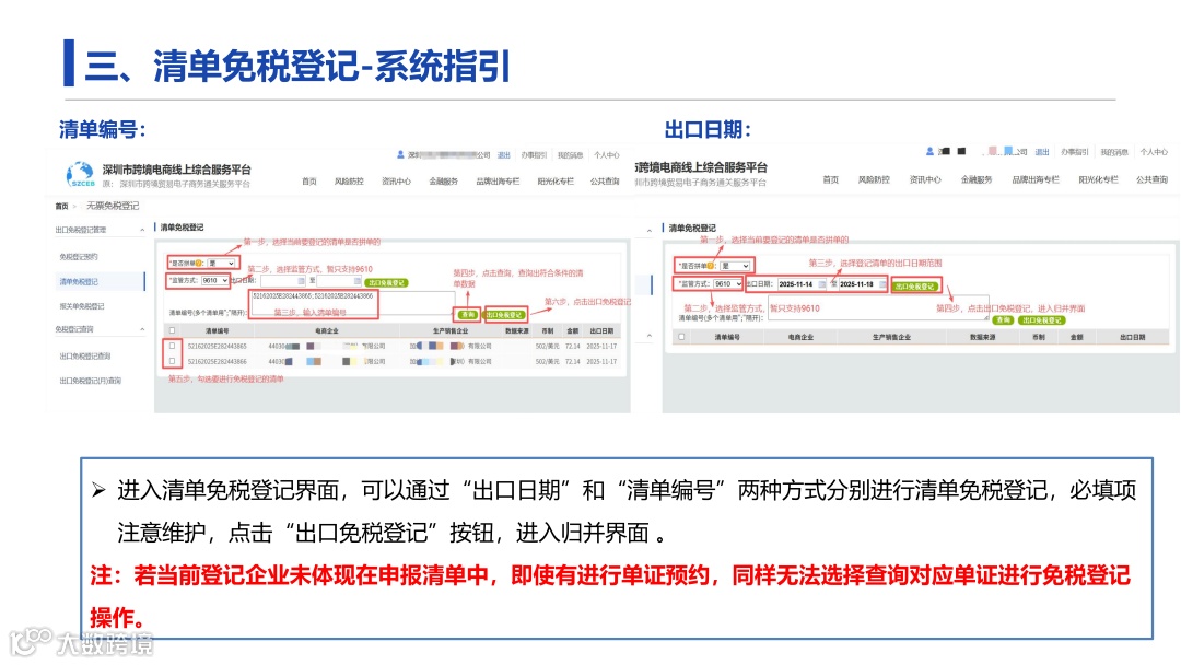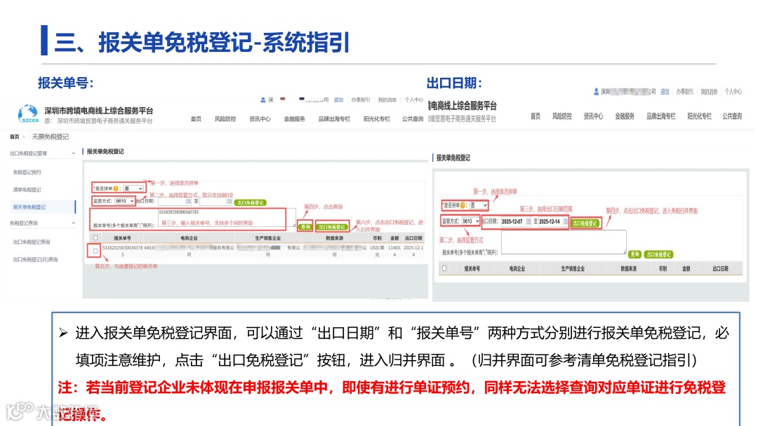 ②登记预约1~2日后,根据预约单证数据,进行报关单/清单的免税登记。
