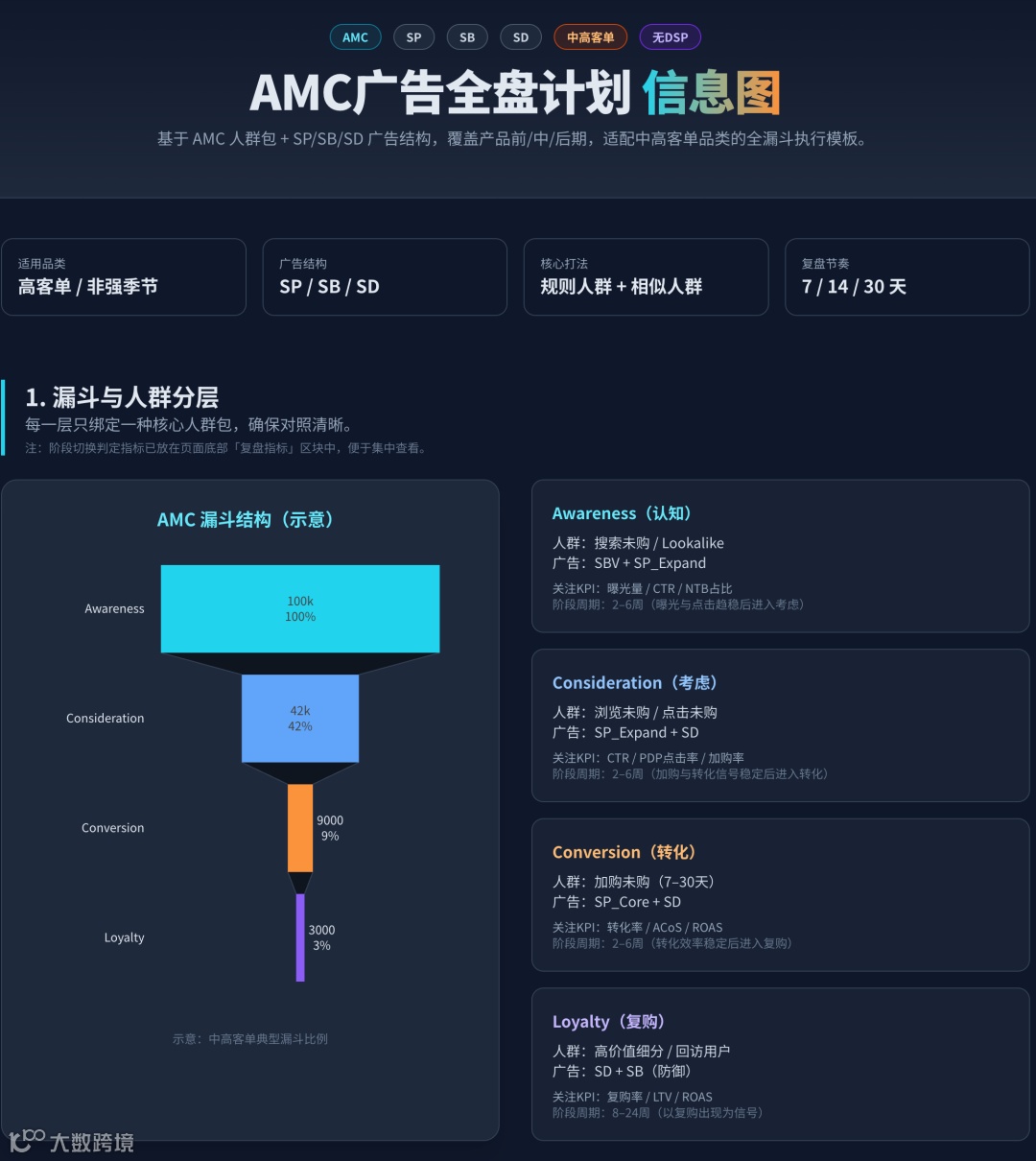 AMC本身并非全新概念,广告漏斗模型和各类广告产品(如SP、SDV、SBV)也早已存在。真正的突破在于能否将“人群包 + 广告结构 + 漏斗阶段”三者系统整合,形成可执行、可追踪、可复盘的全盘广告计划。