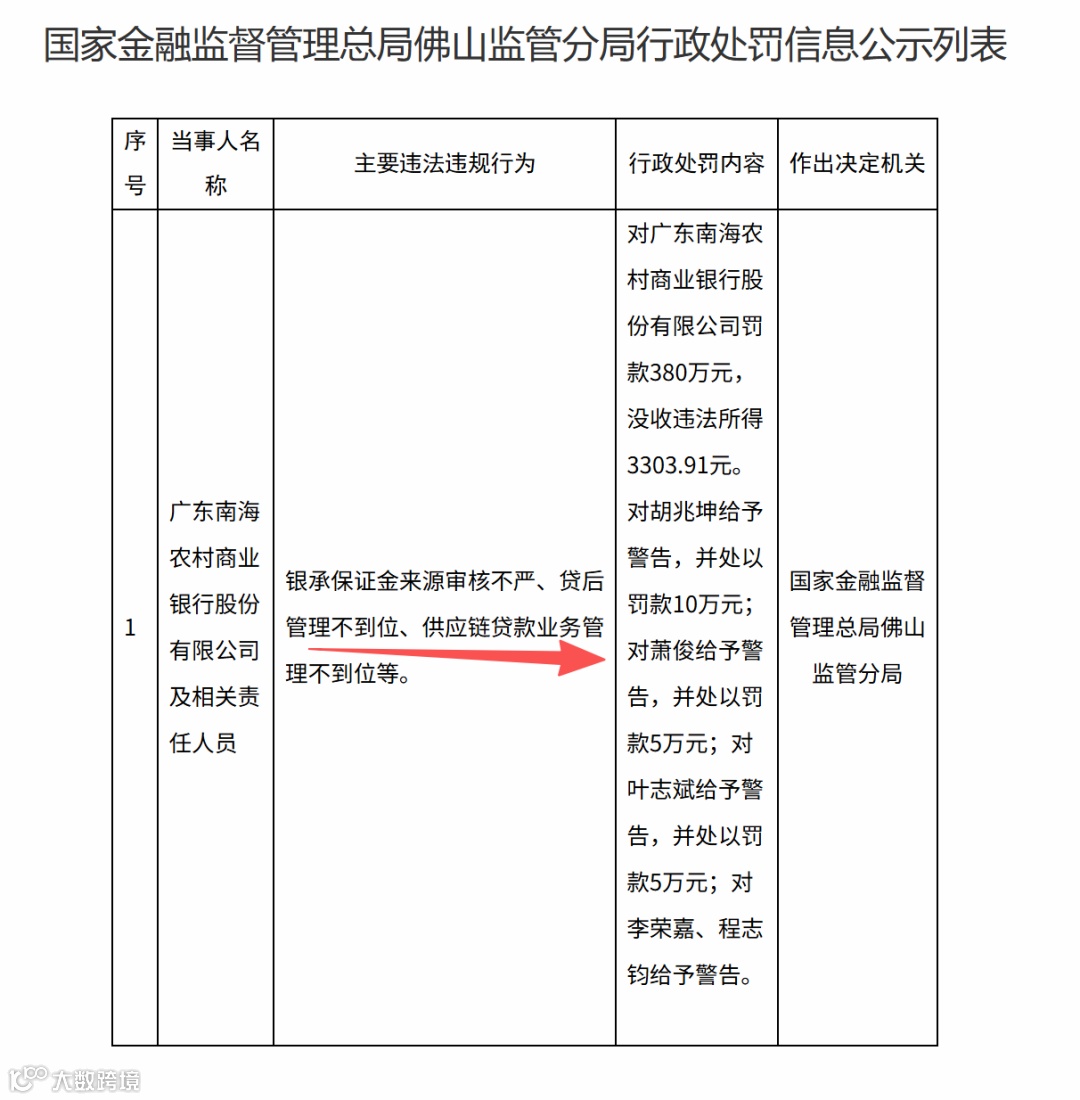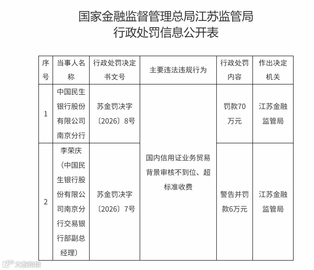 1月28日,民生银行江苏分行因“国内信用证业务贸易背景审核不到位、超标准收费”受到处罚。1月30日,南海农商行因“银承保证金来源审核不严、贷后管理不到位、供应链贷款业务管理不到位”等监管处罚。