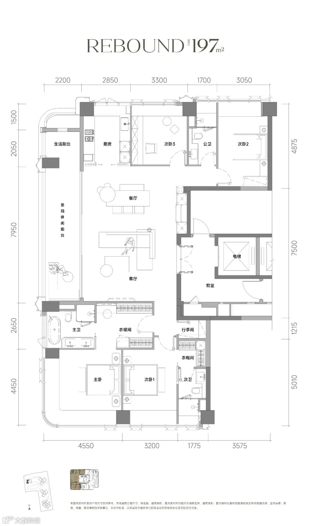 建面约197㎡户型,含电梯厅综合赠送后使用率可达93-95%。