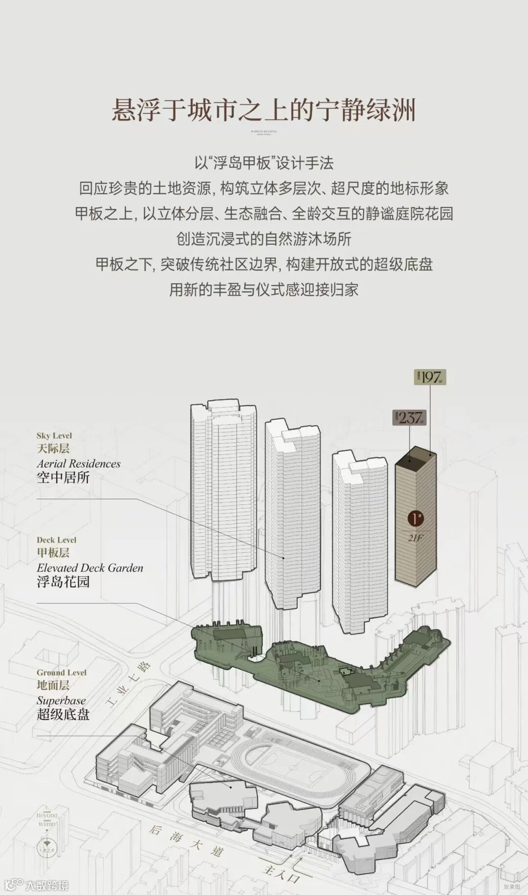 后海招商玺则打破公区品质“销售化”的窠臼,利用浮岛甲板设计进一步拓展了生活维度。