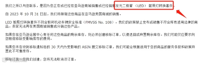 美国站的不少卖家收到邮件,主要内容是:2023年10月31日起,LED前照灯转换套件在亚马逊全面禁止销售,相关Listing会被关闭,库存要移除,LED前照灯转换套件的英文名字是Light emitting diodes headlamp conversion kits。