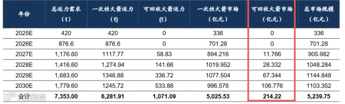 到2030年,中国火箭发射市场规模有望超过1100亿元;其中按可回收火箭承担约30%运力、单位成本约2万元/千克的假设测算,2030年回收火箭对应的市场规模约为60–120亿元(取决于年度总运力1000–2000吨的区间)。