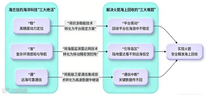 那么一家搞海洋科技的公司又和火箭有什么关联呢?便是文章开篇提到的,公司凭借其在海洋监测与智能船艇领域的核心高技术,成功切入了的商业航天赛道,海兰信一时间被冠以火箭回收第一股的名号。下图展示了海兰信使用怎样的技术,通过场景转化,预设攻克火箭回收部分难题的完整过程。