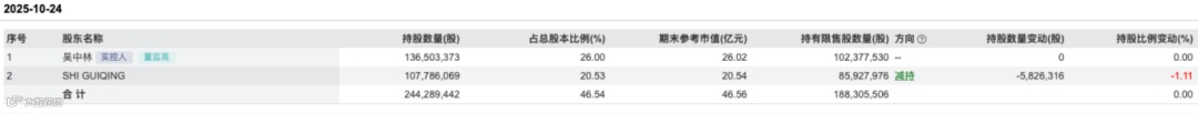 • 增减持:对比2025年三季度报,时桂清(SHI GUIQING)女士于2025年10月24日减持678.46万股,持股比例减少1.4%,减持后持股占总股本比例为20.53%。