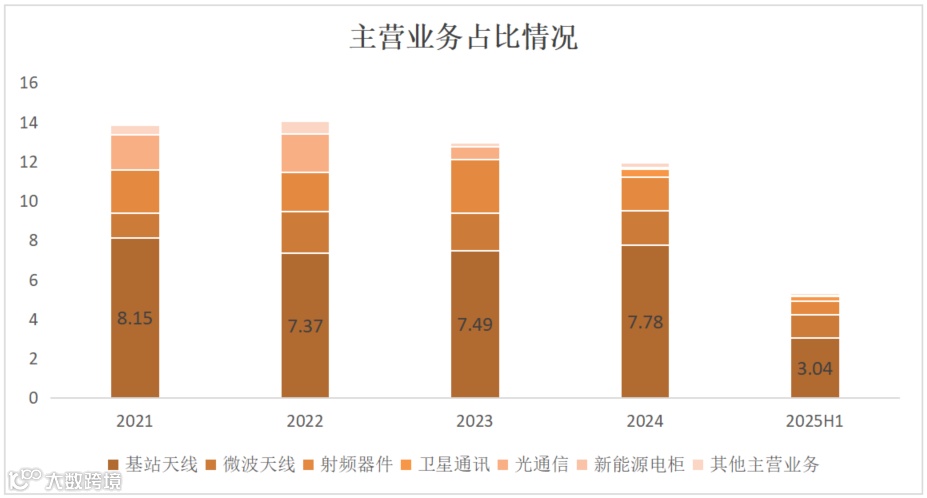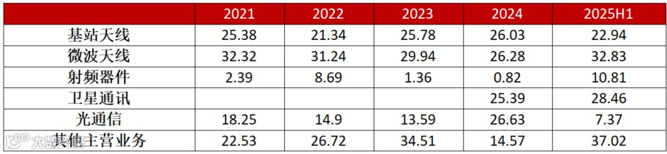 • 传统业务(基站天线、射频器件):基站天线是公司收入占比最大的业务。近年来,由于国内5G网络建设放缓,运营商资本开支减少,导致国内市场竞争加剧,产品价格承压,毛利率较低。2025年上半年,基站天线和射频器件的收入同比分别下降13.55%和23.88%,毛利率也出现小幅下滑。 -