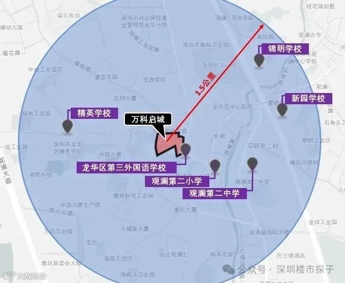 万科启城家园自带幼儿园学校、毗邻龙华区第三外国语九年制学校,另外万科启城家园观澜二中、观澜二小距离万科启城家园也都不远。万科启城家园1.5公里范围内还分布有锦明学校、新园学校、精英学校等。