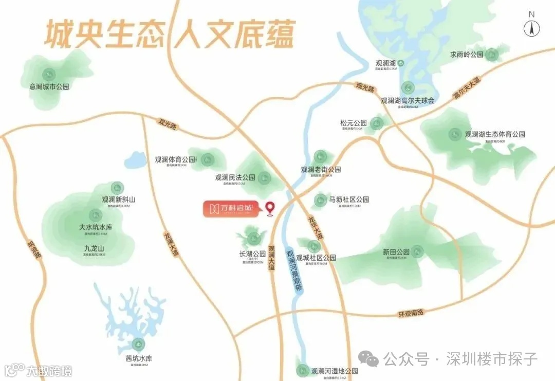 项目周边汇集五大公园,观澜湖生态体育公园(运营)、观澜民法公园、观澜体育公园(在建)、观澜河湿地公园、长湖公园(规划)及茜坑水库。