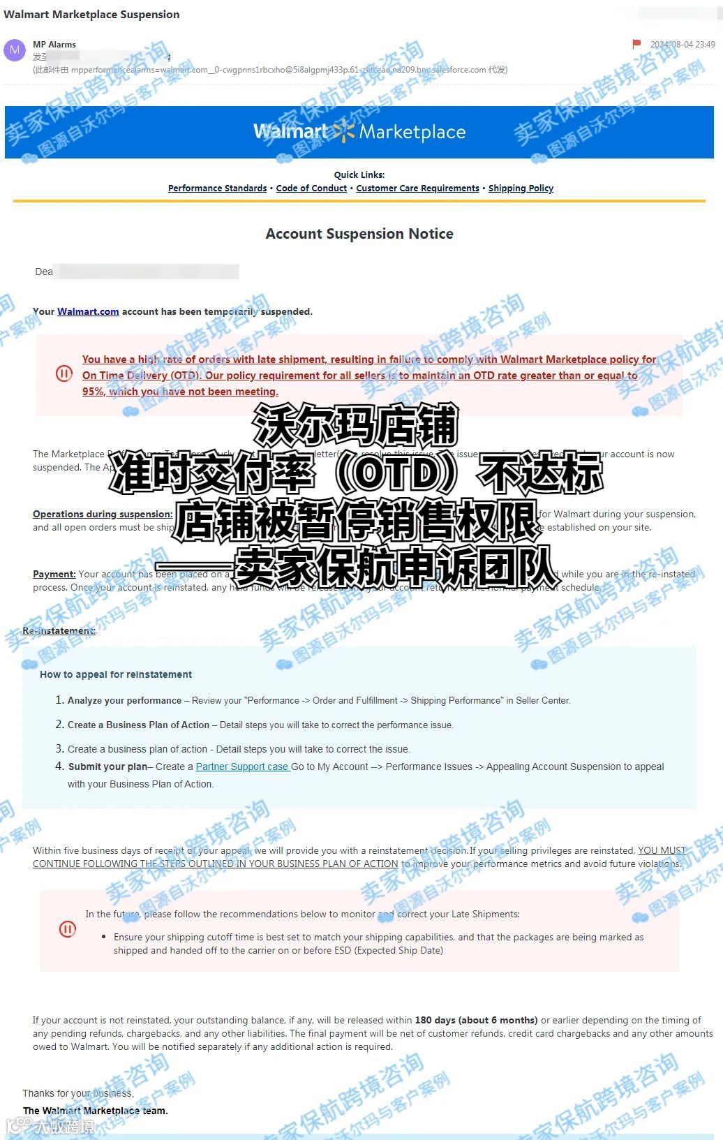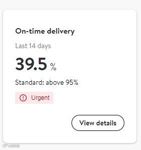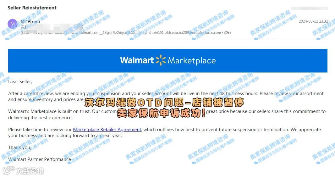 卖家在今年8月初收到了沃尔玛的绩效警告,不仅表示卖家因为“准时交付率(OTD)”正在接受临时审核,并且暂停了卖家的店铺销售权限。