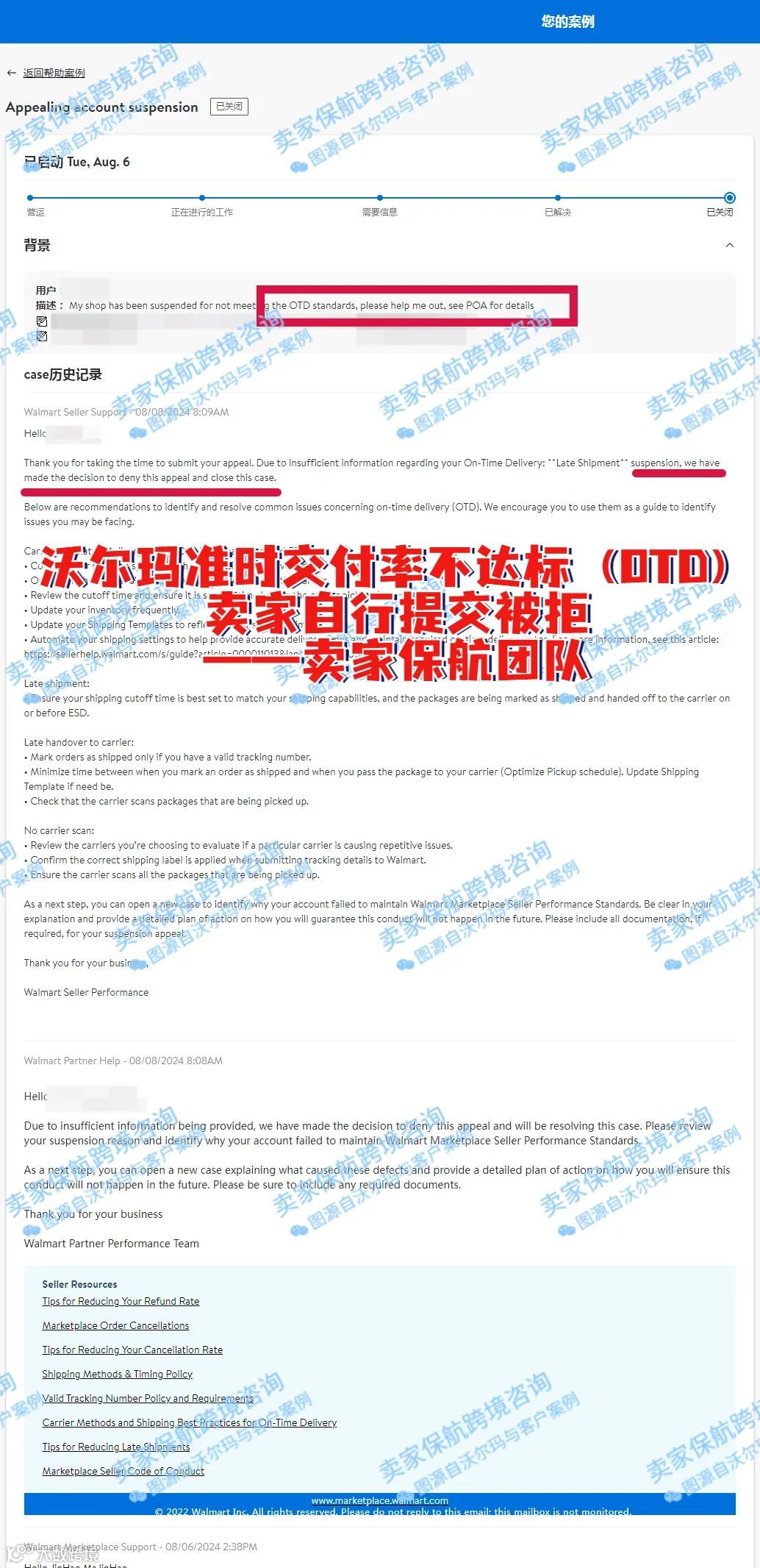 卖家自行提交过一次申诉,但很快就被沃尔玛团队拒绝,因此找到我们团队进行求助。