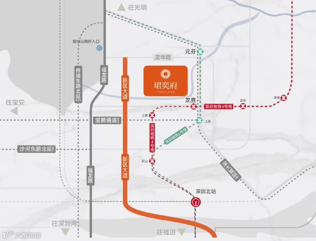 距离4号地铁线“龙胜站”约500米,距离6号线元芬站约800米,3站深圳北, 5站福田;另有深大城际连接;临近主干道布龙路,福龙路,未来还有侨城东路北延(在建中)、沙河东路北延(规划中)、宝鹏通道(规划中)。