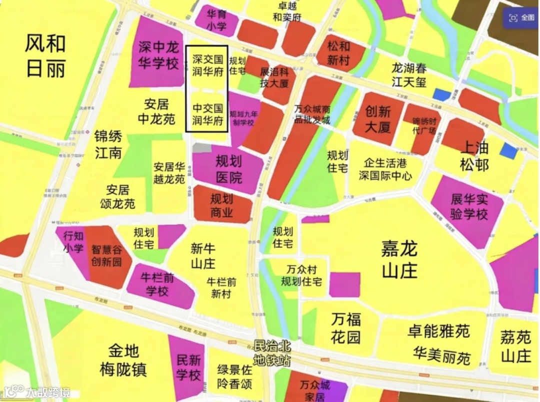 1、首先从区位来看,中交国润华府所处的龙华民治老中心区板块,周边是大家熟知的风和日丽,锦绣江南这些楼盘,西北侧是壹城中心,西南侧邻居民治跟红山板块,区位是比较不错的,在龙华而言也算是第二梯队的板块。