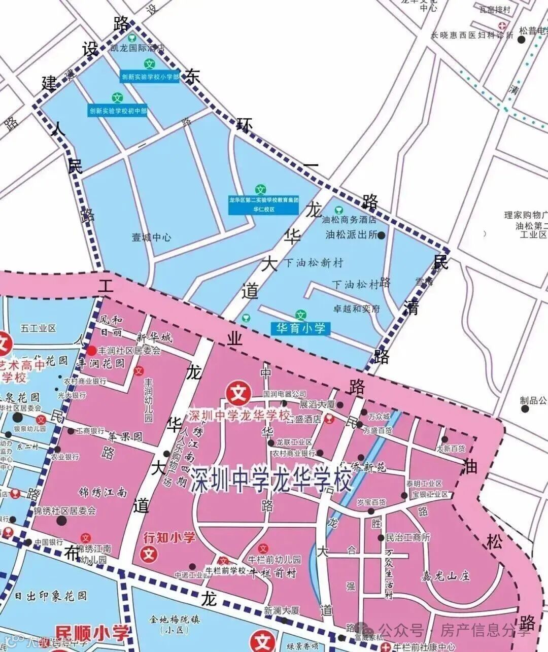 划分范围:民治街道(除单校划片学区外)和龙华街道东环一路以南、民清路以西、工业路以北、人民路以东、建设路以东(蓝色虚线框)范围。