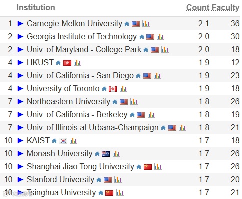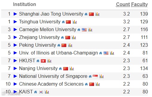 在最新发布的综合排名中,上海交通大学与清华大学并列全球第一;浙江大学、卡耐基梅隆大学并列第三;北京大学与伊利诺伊大学厄巴纳-香槟分校(UIUC)并列第五。前十名中,中国高校超过半数,显示出中国在计算机科研领域的整体实力。