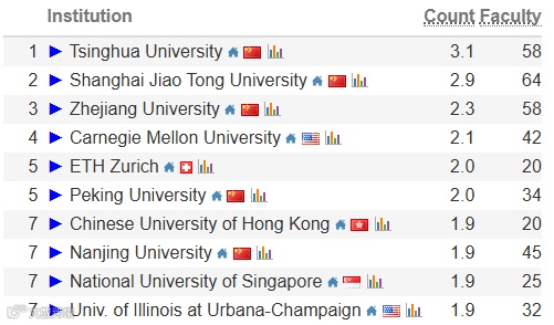 在人工智能领域,北京大学、清华大学、浙江大学包揽全球前三。上海交通大学、南京大学、中国科学院等也进入前十,形成明显优势。
