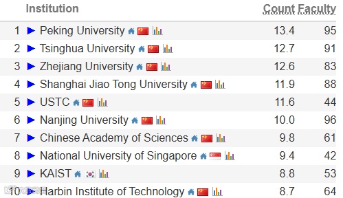 在全球前100名的机构中,美国高校占据40+所,中国有近30所机构入围,包揽了前70%的席位。