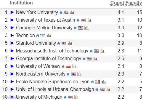 在计算机理论领域,纽约大学排名第一,德克萨斯大学奥斯汀分校与卡耐基梅隆大学分列第二、三位。