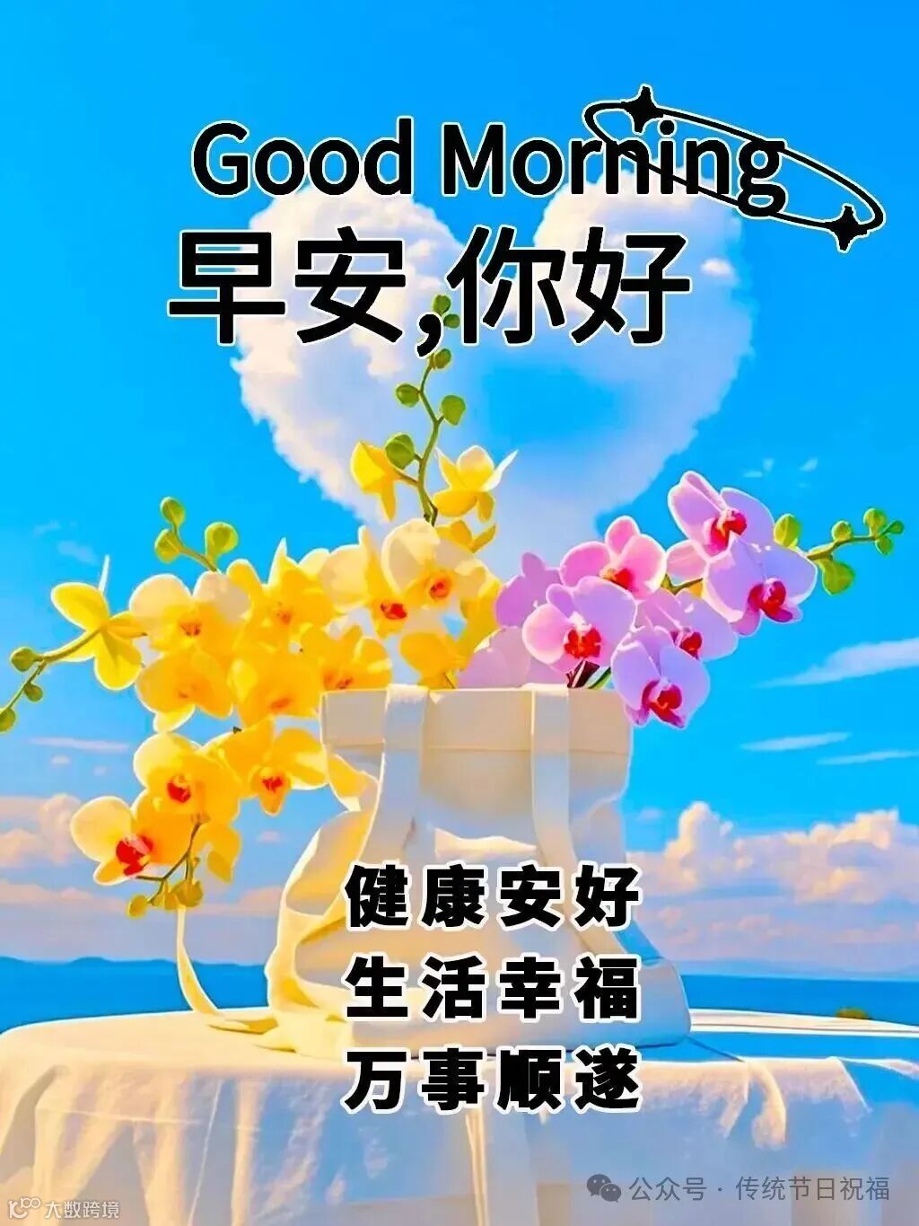 1、早安,新的一天,把平安送给最善良的人,把思念送给最知心的人,把祝福送给我珍惜的人!把好运送给我问候的人!早安吉祥!