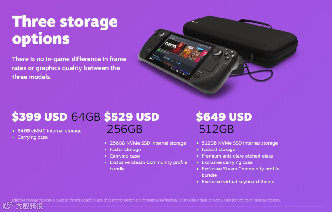 存储方面提供三种版本:64GB eMMC、256GB NVMe SSD和512GB NVMe SSD,均支持microSD扩展。其中入门款售价399美元(约合人民币2576元)。