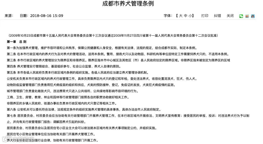 邹静:以成都为例,《成都市养犬管理条例》由市人大常委会通过,属地方性法规。其中烈性犬、大型犬品种目录由动物防疫监管部门会同公安机关制定并公布,属于授权管理。
