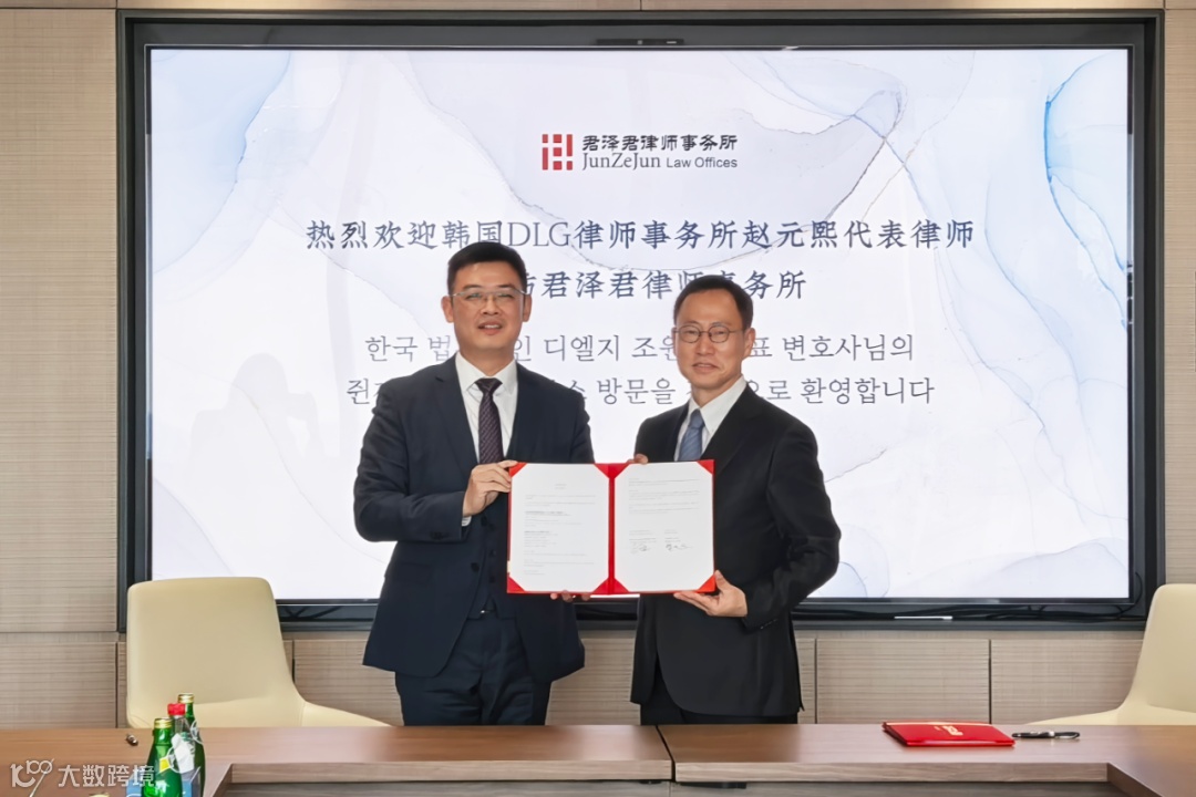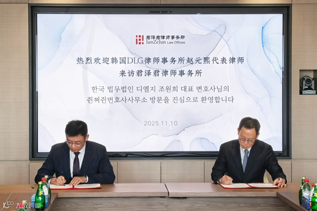 2025년 11월 10일, 한국 법무법인 DLG(디엘지) 조원희 대표변호사, 김도균 고문, 김혜수 사업개발부장은 베이징시쥔쩌쥔변호사사무소(쥔쩌쥔)를 방문하였다. 쥔쩌쥔의 관리위원회 위원이자 고급파트너인 리양(李旸) 변호사, 고급파트너 션원하오(申文浩) 변호사, 파트너 청훙메이(程红梅) 변호사와 파트너 류량융(刘良勇) 변호사, 외국법자문사 박재영(한국변호사)가 방문단을 맞이하여 환영하였고, 양측은 협력 양해각서(MOU) 체결식을 진행하였다.