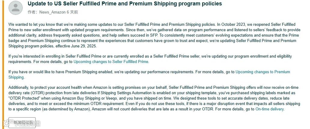 2025年6月29日起,亚马逊将对卖家自配送Prime及优先配送选项政策进行更新。