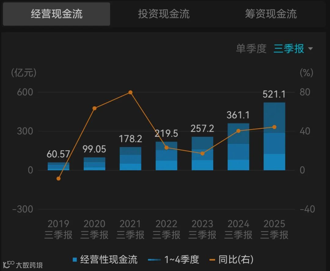 2025年前三季度经营现金流521亿元,同比暴增44%——利润还没到账,现金先到账。